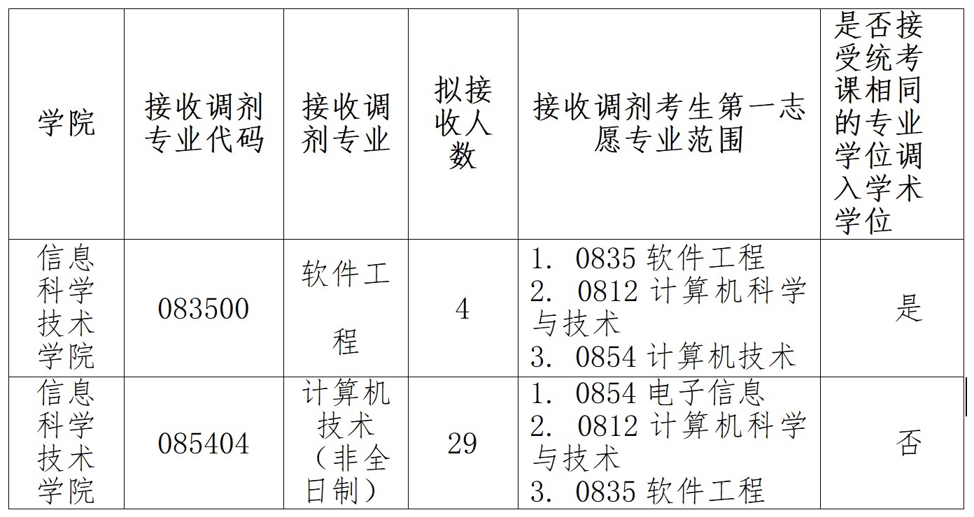 拟接收的调剂专业和要求如下表,其中统考科目应与调入专业全国统一命题科目相同,调剂时数学一、二和英语一、二可由高向低调剂,不可由低向高调剂,初试专业课科目与调入专业初试科目相同或相近。符合调剂报考条件的考生可登录中国研究生招生信息网://yz.chsi.com.cn,(以下简称“研招网”)填报信息。
